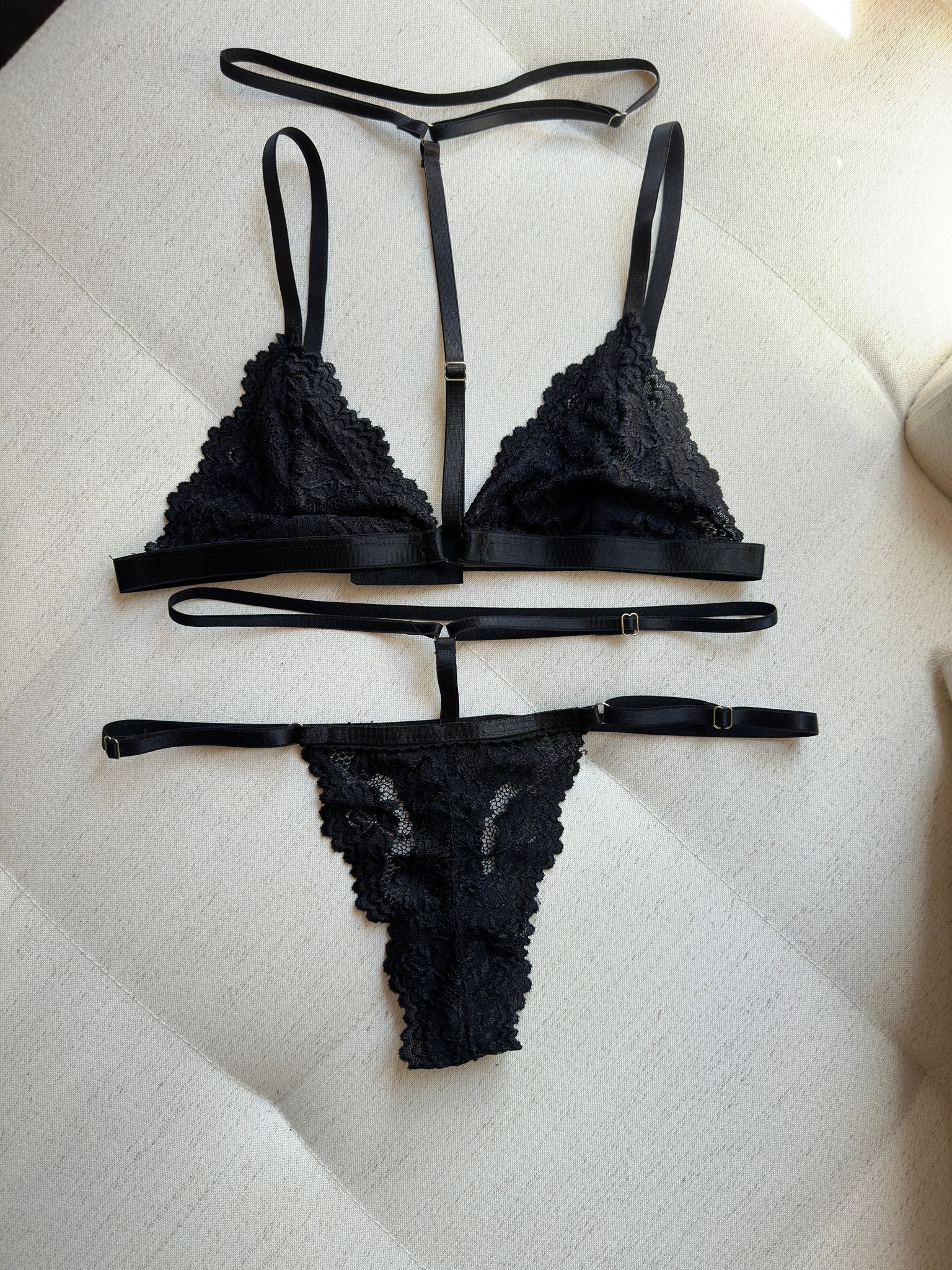 Conjunto de encaje bicolor y less regulable. Con arnes al cuello y cintura regulables.