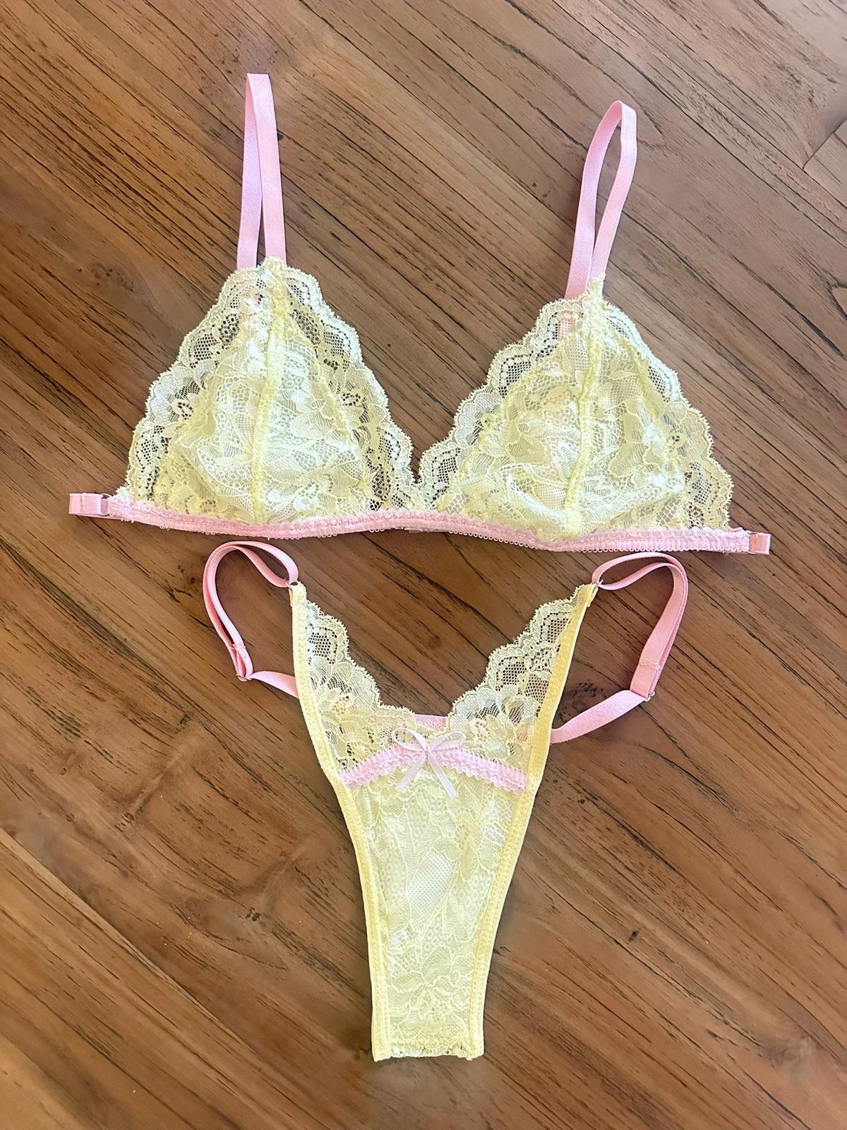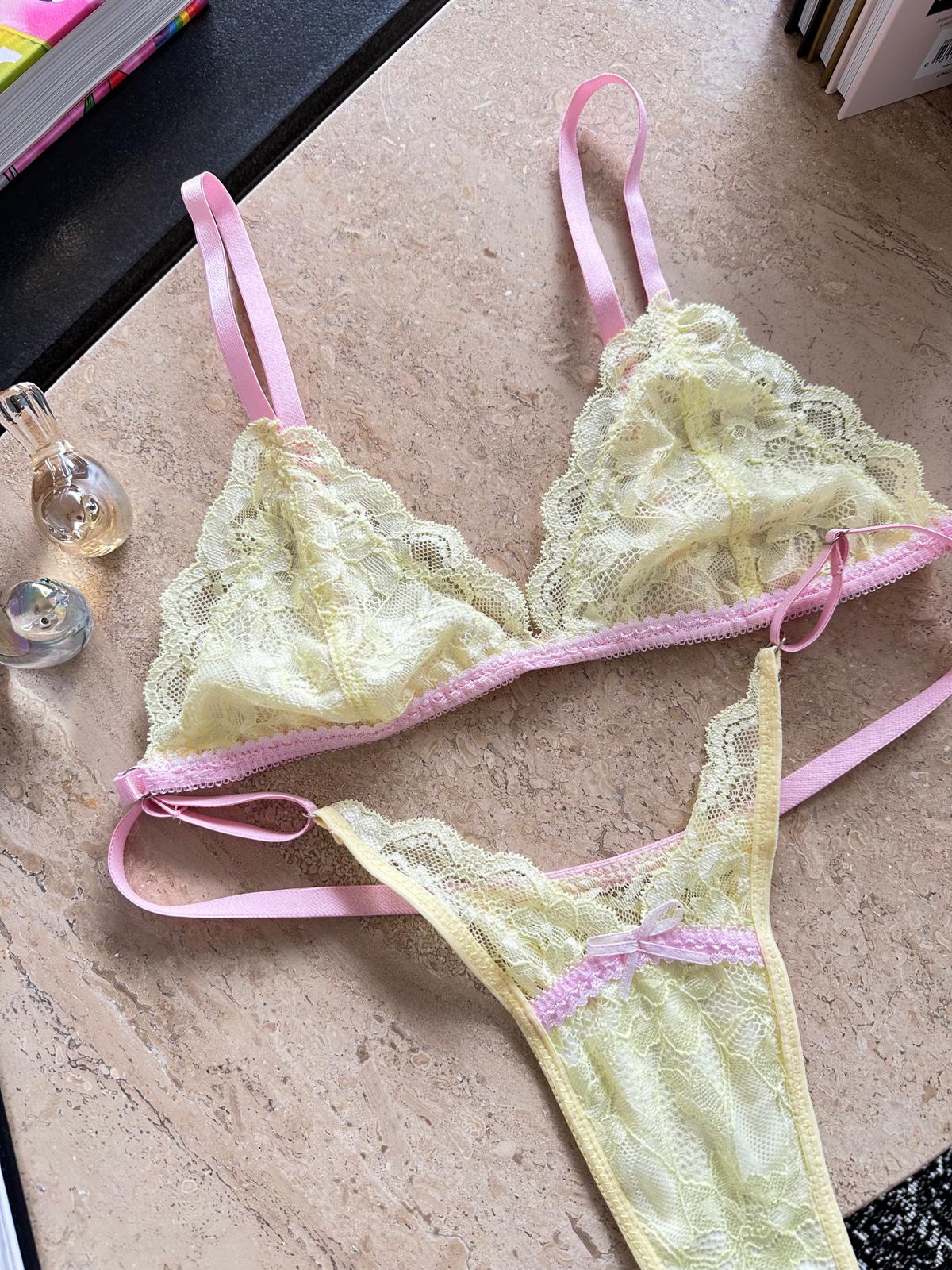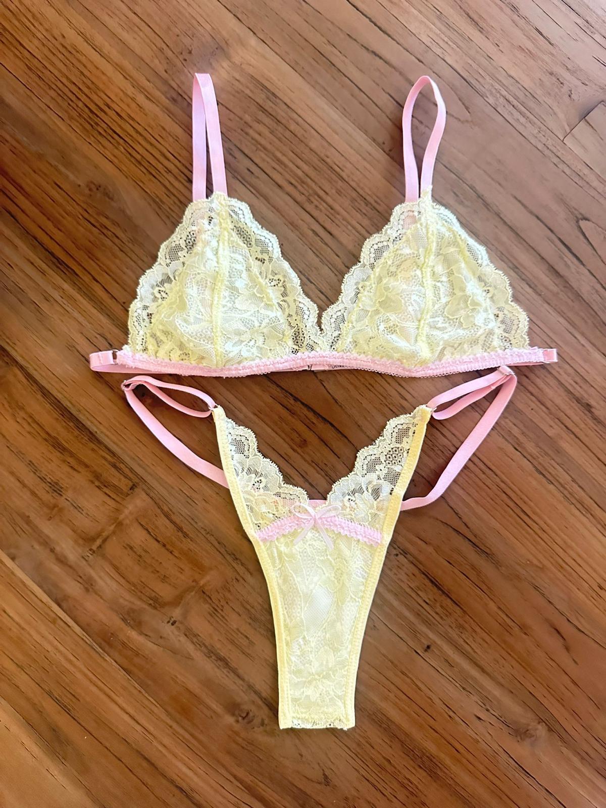 El contraste entre el amarillo suave y los detalles rosados crea una estética fresca, femenina y magnética. Perfecto para quienes buscan una sensualidad sutil, armoniosa y luminosa.